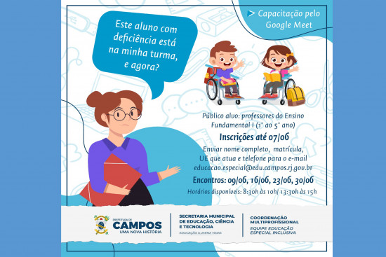 Este aluno com deficiência está na minha turma, e agora? Esse será o tema de mais uma formação do projeto de capacitação continuada para professores do ensino regular na perspectiva da educação especial inclusiva "Inclusão se faz com conhecimento". A capacitação é realizada pelo Departamento de Educação Especial Inclusiva, ligada à Coordenação Multiprofissional da Secretaria Municipal de Educação, Ciência e Tecnologia. Destinada aos professores do Ensino Fundamental I (1° ao 5° ano), a formação receberá inscrições até segunda-feira (7).