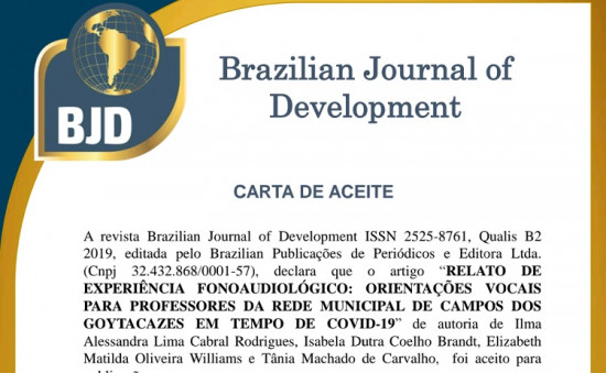 O artigo “Relato de Experiência Fonoaudiológica: orientações vocais para professores da rede municipal de Campos dos Goytacazes em tempo de Covid-19” foi publicado na Revista Brazilian Journal of Development, Qualis B2, editada pelo Brazilian Journals Publicações de Periódicos e Editora. O texto é de autoria das servidoras do Programa Saúde na Escola (PSE), da Secretaria Municipal de Educação, Ciência e Tecnologia (Seduct), Ilma Alessandra Lima Cabral Rodrigues, Isabela Dutra Coelho Brandt, Elizabeth Matilda Oliveira Williams e Tânia Machado de Carvalho, e foi aceito em 25 de junho para publicação.