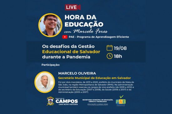 O convidado participará do Projeto Hora da Educação, nesta quinta-feira (19), às 18 horas, com o secretário municipal de Educação, Ciência e Tecnologia de Campos, Marcelo Feres