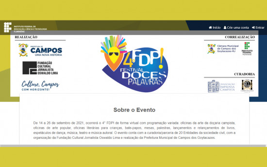 O 4º Festival Doces Palavras (FDP!), promovido pela Prefeitura de Campos, por meio da Fundação Cultural Jornalista Oswaldo Lima (FCJOL), conta com a correalização do Instituto Federal de Educação, Ciência e Tecnologia Fluminense (IFFluminense), que, entre outras contrapartidas, ofereceu seu Portal de Eventos para que a comunidade acompanhe a programação do FDP! e possa se inscrever nas oficinas virtuais e em outras atividades que tenham vagas para inscrição. O ato de se inscrever garante a emissão de certificado ao participante.
