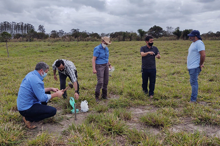 Pesquisadores da Empresa Brasileira de Pesquisa Agropecuária (Embrapa) e o secretário municipal de Agricultura, Pecuária e Pesca, Almy Junior, visitaram, na manhã desta quinta-feira (23), a Fazenda Velha Inácia, propriedade rural na Estrada da Pataca, Baixada Campista, onde poderá abrigar o primeiro polo de produção de Carne Baixo Carbono de Campos. Os pesquisadores Cláudia Pozzi Jantalia e Jerri Zilli (Embrapa Agrobiologia) e Fabiano Balieiro (Embrapa Solo) colheram amostras do solo, estudaram a vegetação e verificaram documentos com análises realizadas na propriedade para, posteriormente, apresentar um projeto específico, com sistema de integração lavoura-pecuária-floresta (LPF) ou lavoura-pecuária (LP), para neutralizar os gases de efeito estufa emitidos pelo processo produtivo da bovinocultura de corte.