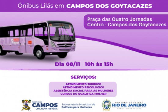 O município de Campos recebe na próxima segunda-feira (08), das 10h às 15h, o Ônibus Lilás do Governo do Estado, um equipamento volante que oferece vários atendimentos às mulheres. O ônibus estará na Praça da Quatro Jornadas, no Centro. A vinda do ônibus é uma parceria com a prefeitura, através da Secretaria Municipal de Políticas para Mulheres, e faz parte da programação dos 21 Dias de Ativismo pelo Fim da Violência contra as Mulheres, campanha anual e internacional que começa no dia 25 de novembro, Dia Internacional da Eliminação da Violência contra as Mulheres, e segue até o dia 10 de dezembro, Dia Internacional dos Direitos Humanos.