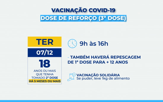 A segunda dose da AstraZeneca é para quem tomou a primeira dose até o dia 08 de novembro e a vacina da Pfizer para quem tomou a primeira até o dia 12 de novembro. Aqueles que tomaram a primeira dose da CoronaVac até o dia 22 de novembro também devem comparecer aos postos para a segunda dose. Todos devem apresentar documento com foto, CPF, cartão de vacinação contra a Covid-19 e o comprovante de residência.