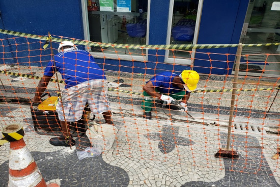 A obra foi iniciada nesta segunda-feira (06) e compreende na retificação nas laterais das canaletas para que as de concreto armado, que tem maior espessura, possam ficar niveladas com o piso das pedras portuguesas