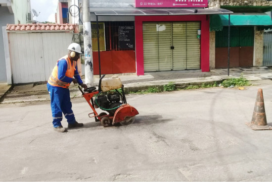 Um das equipes de manutenção de vias da Secretaria de Obras e Infraestrutura realiza obras de reparos nas ruas do bairro