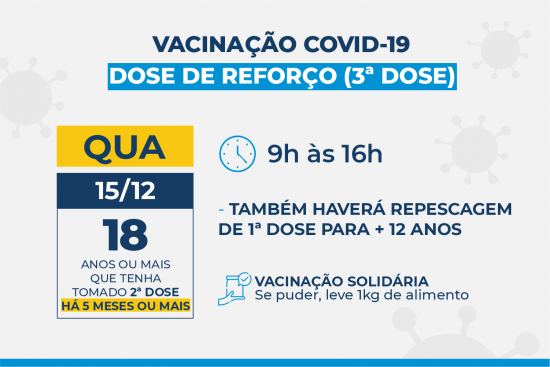 A segunda dose da AstraZeneca é para quem tomou a primeira dose até o dia 12 de novembro e a vacina da Pfizer para quem tomou a primeira até o dia 19 de novembro. Aqueles que tomaram a primeira dose da CoronaVac até o dia 29 de novembro também devem comparecer aos postos para a segunda dose. Todos devem apresentar documento com foto, CPF, cartão de vacinação contra a Covid-19 e o comprovante de residência.