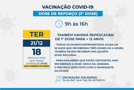 O intervalo da terceira dose das vacinas contra o novo coronavírus, também conhecido como dose de adicional, foi reduzido de cinco para quatro meses. A medida começa a valer em Campos, a partir desta terça-feira (21), e segue recomendação da Secretaria Extraordinária de Enfrentamento à Covid-19 do Ministério da Saúde. O objetivo é ampliar a proteção, principalmente contra a variante Ômicron, com contaminação comunitária em São Paulo, além de reduzir possíveis hospitalizações e óbitos, em especial em grupos de risco.