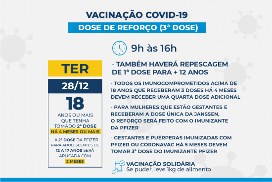 Devem receber a terceira dose, com intervalo de quatro meses, as pessoas com idade igual ou superior aos 18 anos, independente do imunizante recebido na segunda dose (Pfizer, AstraZeneca ou CoronaVac). Adolescentes não estão inclusos nesse reforço. Para receber a dose adicional é necessário apresentar documento com foto, CPF ou cartão do SUS, cartão de vacina contra a Covid-19 com as datas de aplicação das duas doses anteriores, além de comprovante de residência.