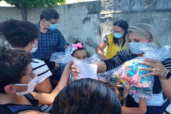 Foram distribuídas roupas doadas por profissionais da rede municipal de ensino, fraldas, chinelos, além de kits de lanches e kits escolares da Seduct para as crianças assistidas
