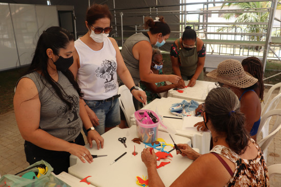 Crianças e adultos participam de oficinas de artesanato na Tenda Cultural