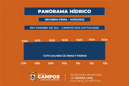 Às 13h, última medição, o rio atingiu a cota de 9,54 metros, 4 centímetros a mais que os 9,50 registrados às 7h