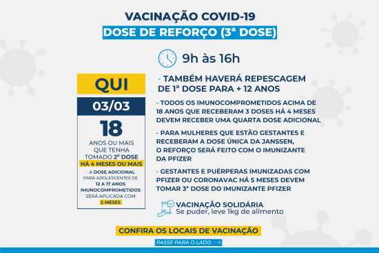 Também será aplicada a terceira dose para as pessoas com idade igual ou superior aos 18 anos que tenham recebido a segunda dose há quatro meses, independente do imunizante. As gestantes e puérperas (45 dias após o parto) imunizadas com Pfizer ou CoronaVac, a terceira dose deve ser feita com o intervalo de cinco meses. O imunizante usado será o da Pfizer. Adolescentes ainda não estão inclusos nesse reforço e devem aguardar a convocação.