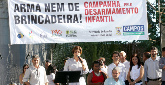 O Dia Mundial pelo Desarmamento Infantil, nesta sexta-feira (15), foi lembrado em Campos pela Secretaria Municipal da Família e Assistência, Secretaria de Educação, Fundação da Infância e Juventude e Fundação de Esporte, com manifestação na praça São Salvador. A Prefeita Rosinha Garotinho abriu a campanha local, que deverá ser permanente, com a soltura de pomba branca, simbolizando a paz, junto com a Secretária da Família e Assistência, Izaura Freire. Além das secretarias e fundações, participaram os programas Projovem e o de Erradi-cação do Trabalho Infantil (Peti).