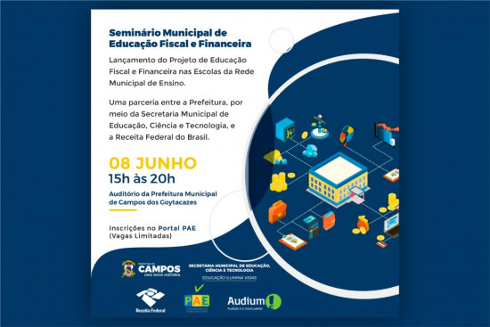 Com o objetivo de difundir a Educação Fiscal e Financeira para crianças e adolescentes da rede pública municipal, o Seminário de Educação Fiscal e Financeira vai ser lançado dia 8 de junho, no auditório da Prefeitura de Campos, das 15h às 18h. As palestras serão ministradas pelo analista tributário, representante regional de Cidadania Fiscal da Receita Federal na 7ª Região Fiscal (Rio de Janeiro e Espírito Santo), Vicente Bruno Cavalcanti de Oliveira, e o auditor Fiscal, representante local de Cidadania Fiscal da Delegacia da Receita Federal em Niterói, Antônio Lopes de Carvalho Neto. As inscrições devem ser feitas no Portal do Programa de Aprendizagem Eficiente (PAE) -