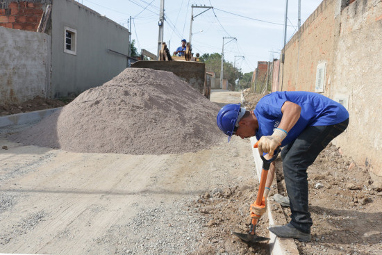 Ao todo são nove ruas que recebem escavação para instalação de meios-fios, construção de base com bica corrida (mistura de brita com pó de pedra) e assentamento de intertravados