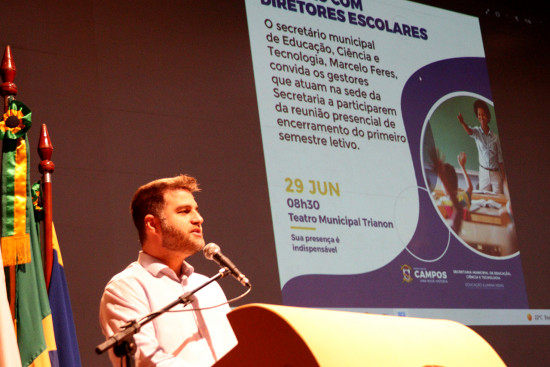 O secretário de Educação Ciência e Tecnologia, Marcelo Feres, promoveu, nesta quarta-feira (29), reunião com diretores das 234 escolas e creches da rede pública municipal, para falar sobre o encerramento do primeiro semestre letivo. O encontro aconteceu no Teatro Municipal Trianon e contou com a presença do prefeito, Wladimir Garotinho. Fizeram parte da mesa a subsecretária geral da pasta, Rita Abreu; subsecretária de Ciência e Tecnologia, Suzana da Hora; subsecretária de Gestão Financeira e Orçamentária, Carla Patrão; e o subsecretário de Gestão Operacional, Nilo Manhães.