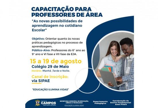 O curso vai ser realizado entre os dias 15 a 19 de agosto e o público alvo são profissionais do 6º ao 9º ano