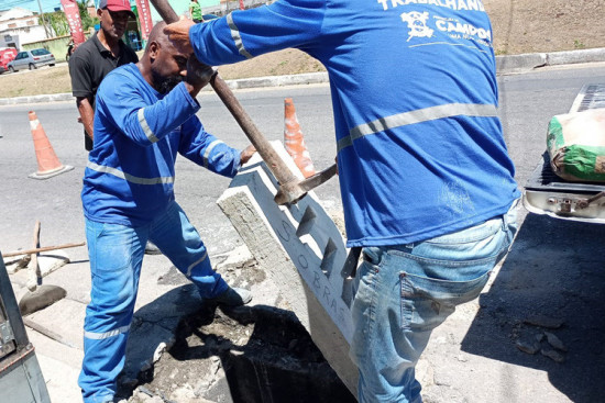 As equipes fazem a limpeza dos bueiros do sistema de coleta de águas pluviais (águas das chuvas) e, também, realizam a substituição dos ralos quebrados ou furtados