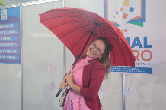 Eliza Morenno, ou como é conhecida, Eliza Poeta. Ela “passeia” pelos corredores da bienal com seu guarda-chuva com versos pendurados, de autores nacionais