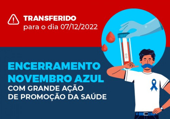 Em virtude da previsão de chuvas, o evento de promoção da saúde, que encerra a campanha Novembro Azul e aconteceria nesta quarta-feira (30), no pátio da Secretaria Municipal de Saúde (SMS), foi transferido para o próximo dia 07 (quarta-feira da semana que vem). A ação acontecerá das 9h às 14h e tem como principal objetivo oferecer esses serviços aos homens, acima de 45 anos, como a dosagem de Antígeno Prostático Específico (PSA), exame de sangue importante na detecção precoce do câncer de próstata.