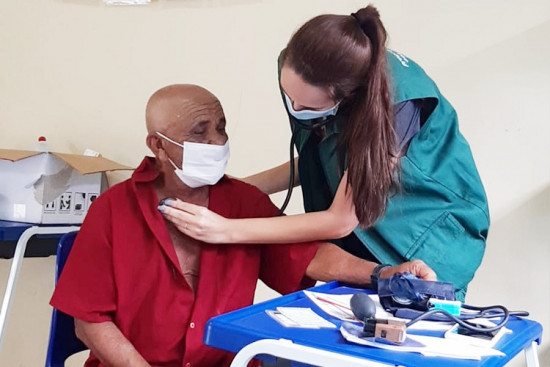 A assistência ao grupo de moradores, realizada por enfermeiros e um médico, engloba consulta, vacinação e a dispensação de medicamentos, quando necessário
