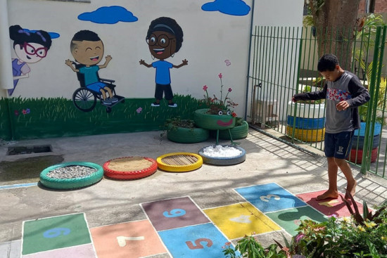 Criatividade! Essa é a palavra que define a Escola Branca Peçanha, no Parque Eldorado. A unidade criou um caminho sensorial junto à Sala de Recursos, com pneus, areia, pedrinhas e muito colorido. A diretora da instituição Neilce Faquer, conta que o espaço, além de divertido, auxilia no desenvolvimento de noções de autonomia, relacionamento com o ambiente, coordenação motora fina e percepções sensoriais.