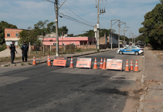 A interdição acontece para operação das grandes máquinas na obra de assentamento da manilha no trecho do deságue na rede de águas pluviais