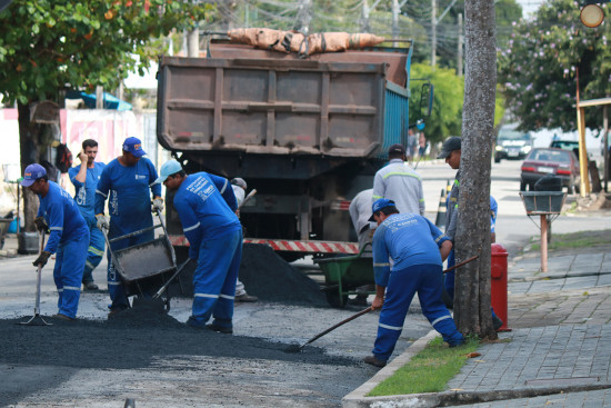 Homens e máquinas atuam nas ruas Francisca Carvalho de Azevedo e Teixeira de Freitas, onde ficam até o final das obras nas demais ruas que precisam