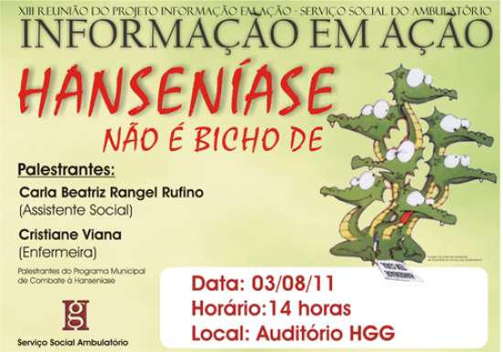 Na próxima quarta-feira (03), o serviço social do ambulatório do Hospital Geral de Guarus (HGG), vai realizar XIII reunião do projeto Informação em Ação, a partir das 14h, no auditório multimídia. O evento terá como tema “Hanseníase não é Bicho de Sete Cabeças”. A programação terá duas palestras sobre a doença, uma ministrada por Carla Beatriz Rangel Rufino, assistente social e outra pelo dermatologista, Edilbert Pellegrini Nahn Júnior, coordenador do Programa Municipal de Combate a Hanseníase.