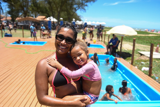 Crianças se divertem no Deck de Piscinas na praia de Farol