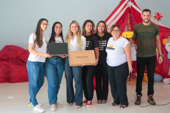 Materiais como notebooks, data show e piscinas, que foram adquiridos através de emendas parlamentares, foram entregues pela primeira-dama Tassiana Oliveira