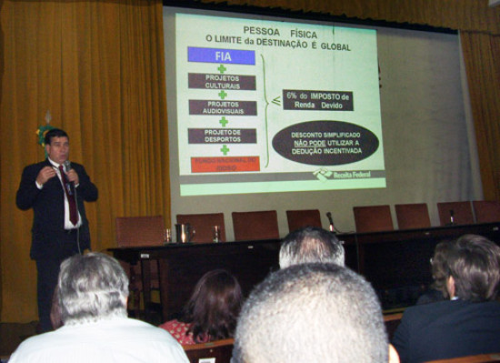 A principal palestra durante o seminário ficou a cargo do professor Gilvan Verbicário Feijó, que falou sobre a destinação de parte do imposto de renda devido, aos fundos de defesa do direito das crianças e adolescentes. “Estamos direcionando aos nossos deputados federais a proposta de se criar uma emenda à lei 8069/90 (Estatuto da Criança e do Adolescente), visando garantir que as contribuições aos fundos municipais dos direitos da criança aconteçam de maneira compulsória, já que o congresso estimula empresas e pessoas físicas a doarem, respectivamente, 1% e 6% do imposto de renda apurado anualmente. Nossa intenção é que a Receita Federal realize o repasse dos percentuais equivalentes, aos fundos devidamente regularizados”, afirmou Mário Lopes.
