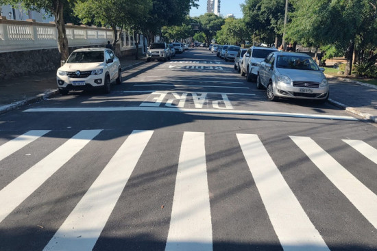 No cruzamento da Rua Barão da Lagoa Dourada com a Gil de Góis está sendo foi implantada sinalização horizontal com os alertas ATENÇÃO, REDUZA E PARE, além de linhas de estímulo à redução de velocidade