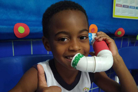 A ferramenta em formato de um telefone de “brinquedo” é produzida artesanalmente com tubo de PVC e está fazendo sucesso entre as crianças