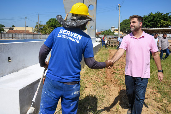 Wladimir, acompanhado do secretário de Obras e Infraestrutura, Fabrício Ribeiro, conferiu os trabalhos desenvolvidos na construção da vila olímpica no bairro que também vai ganhar praça com espaço para esporte e lazer