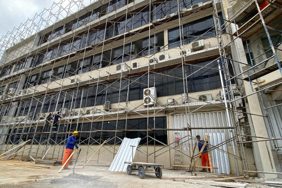 Os serviços, foram iniciados pela montagem de andaimes para a colocação dos vidros na nova fachada do hospital