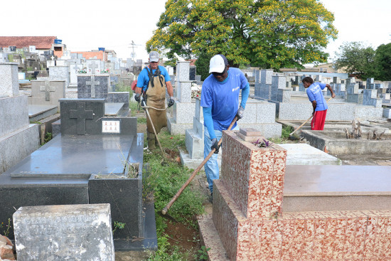 Serviços de varrição, capina manual e química, roçado e limpeza dos caminhos de acesso às sepulturas, começaram nesta segunda-feira nos cemitérios do Caju, Murundu, Santa Bárbara, Vila Nova, Conselheiro Josino e Travessão