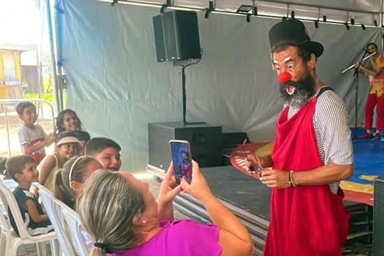 Palhaço Piter Crash comandou a diversão. Programação infantil da Tenda Cultural prossegue no próximo domingo (16), às 11h, com entrada franca