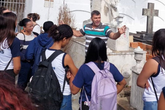 Os alunos da Escola Municipal Albertina Azeredo Venâncio, em Travessão, tiveram uma verdadeira aula de história na tarde desta terça-feira (19), em um City Tour conduzido pelo guia da Secretaria de Turismo, Everaldo Reis, no Cemitério do Caju, o maior do interior fluminense. A ação marcou o Dia Nacional do Patrimônio Histórico e Cultural, comemorado no último dia 17 de agosto. Os alunos do 9° ano, na faixa dos 14 anos, visitaram e conheceram a história de várias personalidades sepultadas no local, como de Maria Queiroz de Oliveira, a Finazinha Queiroz, ex-moradora da Casa de Cultura Villa Maria; e do ex-vereador e ex-deputado federal Bartolomeu Lisandro; do Barão de Guarulhos e Barão de São João da Barra, entre outros.