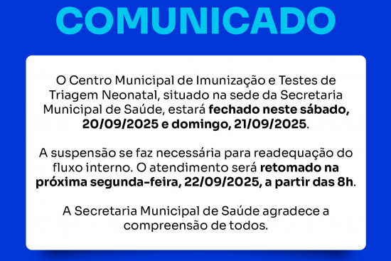 Centro de Imunização e Testes de Triagem Neonatal fechado no sábado e domingo