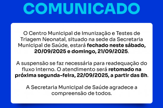 O Centro Municipal de Imunização e Testes de Triagem Neonatal, situado na sede da Secretaria Municipal de Saúde, estará fechado neste sábado (20) e domingo (21). A suspensão se faz necessária para readequação do fluxo interno.
